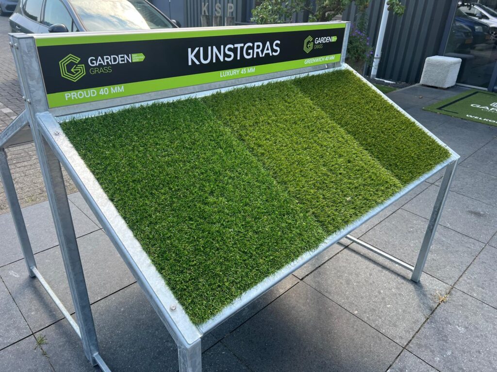 Met dit presentatiemeubel toon je drie van je favoriete kunstgrassoorten professioneel aan klanten. Het meubel kun je personaliseren met je logo. Zo geef je een strakke en herkenbare presentatie.